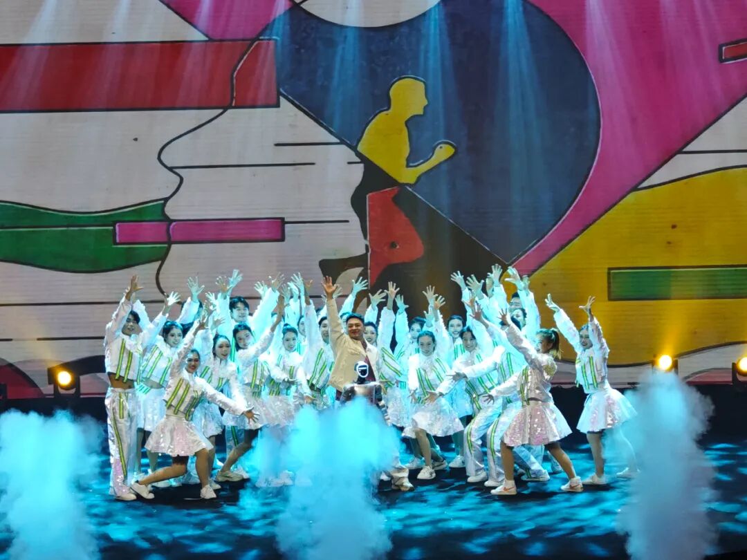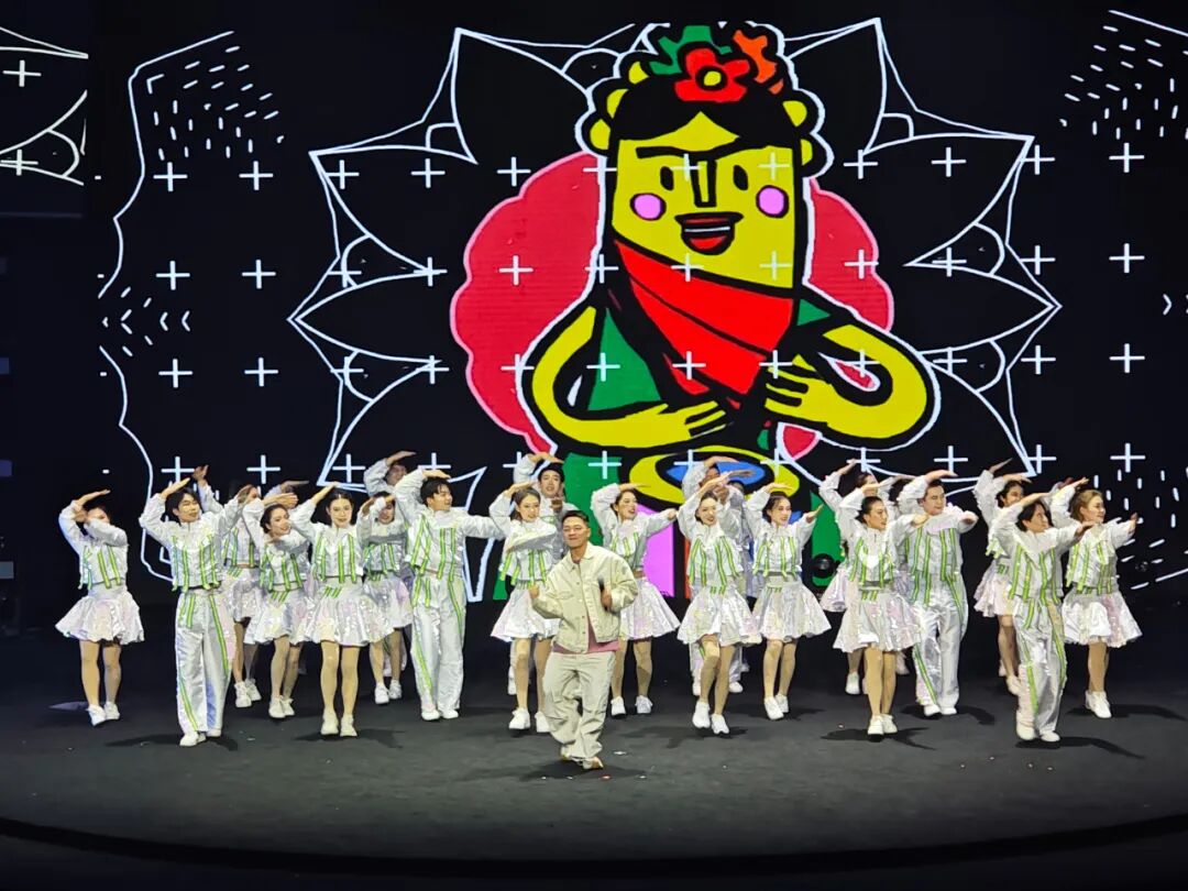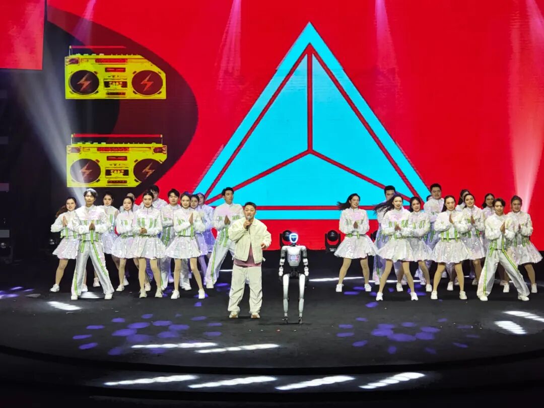 随后,在网红达人“雪饼猴王铁柱”演唱流行歌曲《我爱上班》的节目中,我校学子全程担任伴舞。该节目创新性地引入了机器人舞蹈互动元素,传统舞蹈功底与现代科技创意碰撞,擦出了别样的火花,成为整场晚会的一大亮点。凭借新颖的呈现形式和饱满的表演状态,该节目备受观众瞩目。