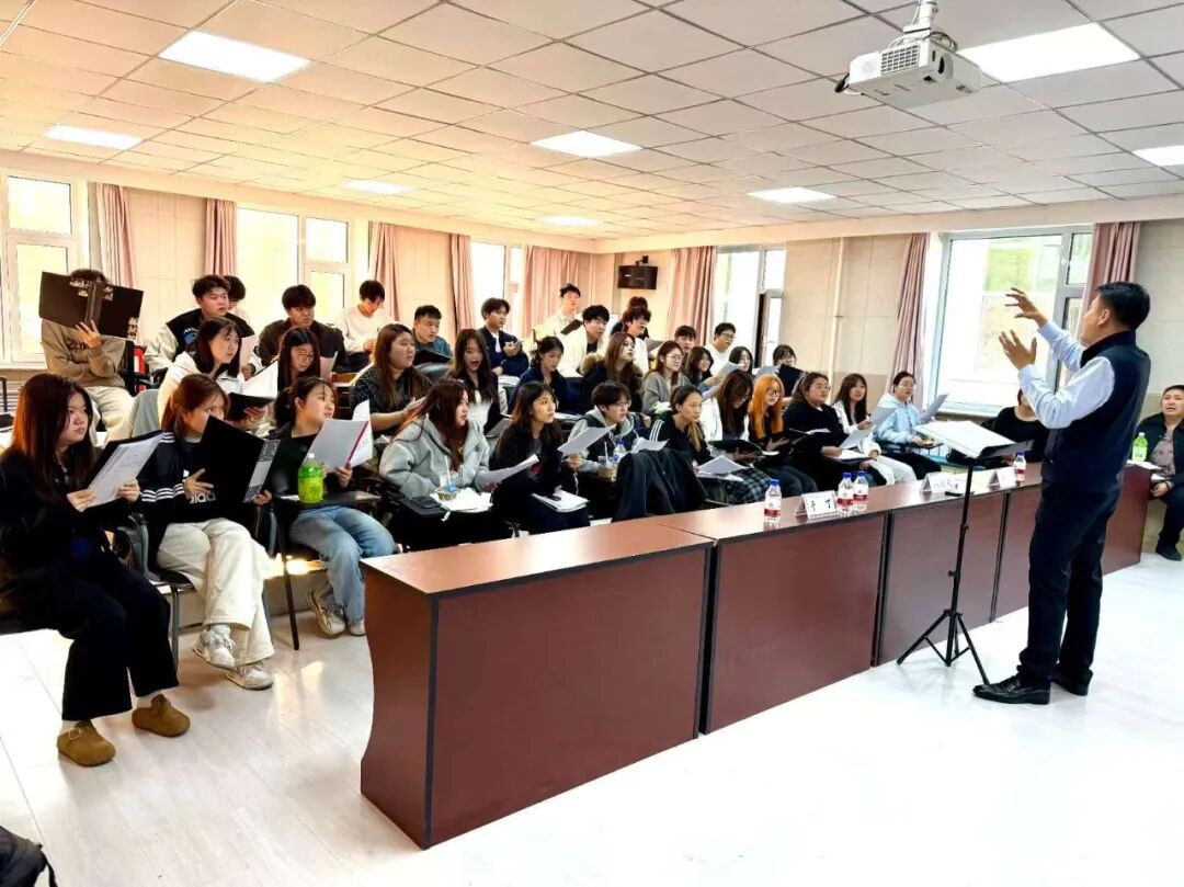 张晓元老师聚焦高水平合唱建设,围绕“合的艺术”展开教学,针对声部平衡、节奏统一、情感表达等难点逐一拆解示范。他选用《生在中国》《我会等》等合唱作品,带领学生现场排练,逐句指导声部衔接、强弱变化与和声融合,手把手纠正细节,有效提升学生合唱实践能力。